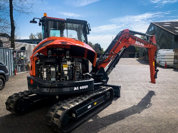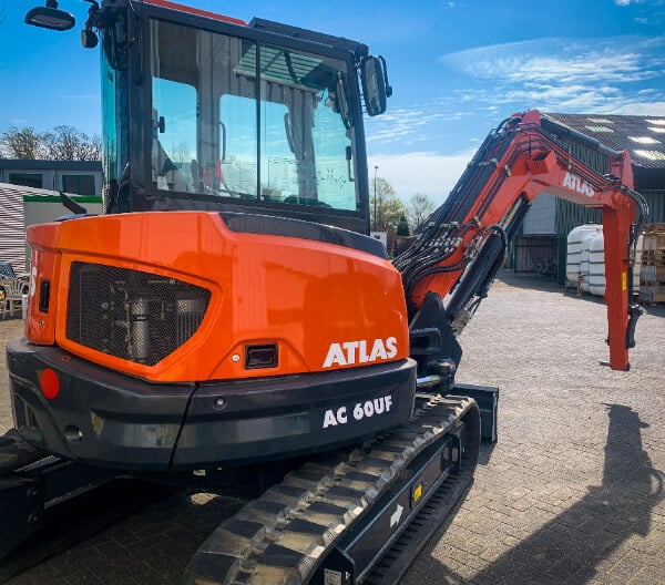 De Atlas AC 60UF binnen draaier met een eigen gewicht van 5,63t is uiterst geschikt voor krappe ruimtes en hierdoor multifunctioneel inzetbaar op diverse werklocaties. De graafmachine is uitgerust met een Kubota motor van zeer hoge kwaliteit en heeft een sterk vermogen. De cabine van de graafmachine is voorzien van een airco, geveerde stoel, radio, en stereo geluid voor de optimale werk ervaring. Ook is er een touchscreen scherm aanwezig in de cabine waarop o.a. de diagnose van de machine en het brandstofniveau te zien zijn.